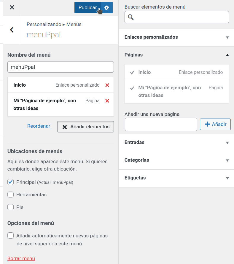 Desde Apariencia, a Personalizar > Menús y utilizaremos «Crea un nuevo menú».